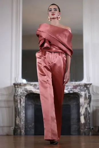 Ayissi played with contrasts throughout: sharply structured jackets alongside softer, draped pieces, and traditional African textiles interpreted with couture techniques. Handwork and tactile details gave the collection both presence and lightness.
