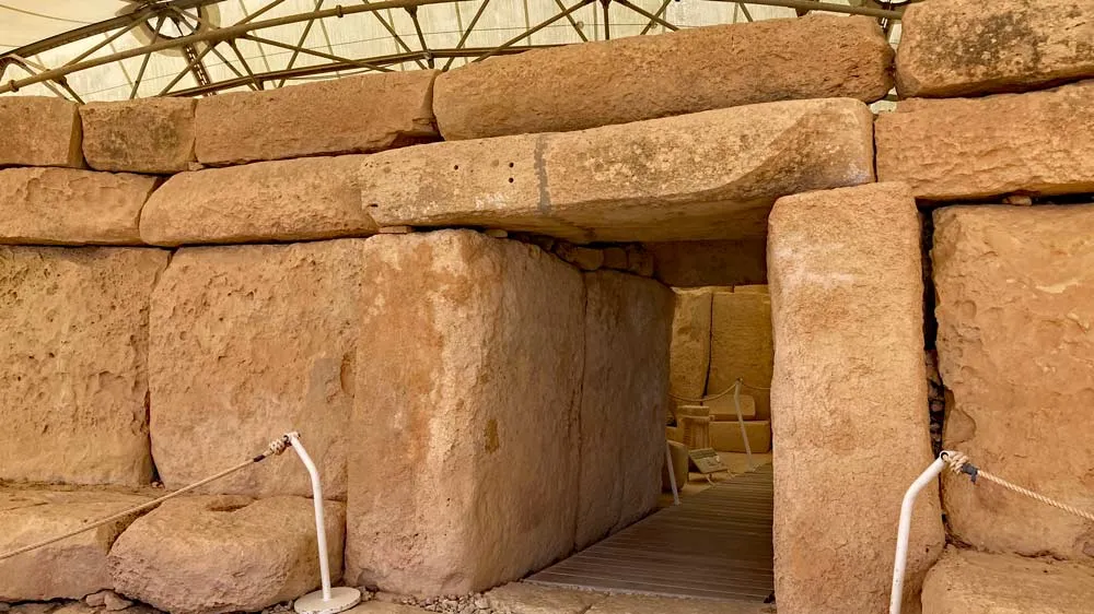 The ruins of Ħaġar Qim are sheltered from wind, sun, and rain by a gigantic tarp that rivals the temple itself. The megalithic temple was constructed from massive blocks of limestone, some weighing as much as twenty tons. The temple testifies to the engineering genius of Malta's earliest inhabitants, who didn't have the wheel, but they did have the inventiveness to fashion spheres of rock, which they used to roll gigantic stone blocks and slabs up hills and across the terrain to the building site. (Some of the blocks still have stone spheres beneath them to this day.)