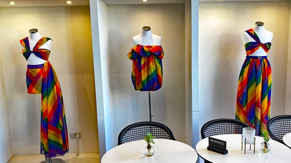 The pair are busy preparing for a show in Milan, where they will debut 30 new looks, on as many models, for Spring and Summer 2024 – "Twenty girls, ten boys," Charles tells us – but they have found time to create some Pride fashions, which are displayed throughout the store: T-shirts, scarves, long skirts, flowing halter tops, and handbags, all reflecting a rainbow motif. Charles and Ron greet our group in person, graciously make time to chat with us. There's more to the story of their first meeting, and Ron recounts it with a laugh. They met, he tells me, at "one of the wildest clubs in Amsterdam. Charles claimed to be a famous fashion designer, telling Ron, "you should come and model for me." That wasn't true... at least, not yet. "As I always say," Ron smiles, "whatever you say is a projection of what's coming." When Ron joined Charles in Malta, they turned that audacious story into reality together, and now C&R has joined the ranks of fashion's major brands.