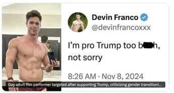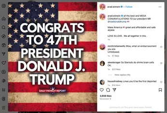 On the day before the election Instinct Magazine reported that adult male star Arad Winwin posted on his Instagram account a graphic which read, "Congrats to 47th President Donald J. Trump" that was originally created by The Daily Patriot, a conservative Instagram account. "In his caption, Winwin wrote, "All the best and MEGA CONGRATULATIONS TO our president MR @realdonaldtrump. Make America great and affordable and safe AGAIN. LOVE IS LOVE. We all together in this." According to Out Magazine, Winwin has a massive social media presence that, as of this writing, includes 507,000 followers on Instagram, 284,000 on X/Twitter, and an active OnlyFans page charging $19.99 per month for a subscription.
