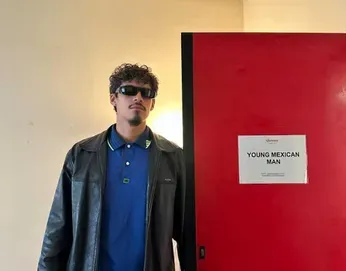 In the photo, he is standing in his dressing room that has the sign "YOUNG MEXICAN MAN" written on it. It is the unnamed character he plays in Guadagnino's adaptation of William Burroughs' unfinished novel.