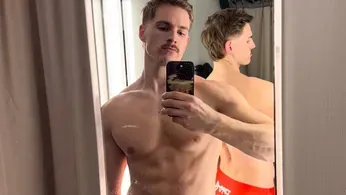 With mirror selfies and close-ups that zoom in on his lap, the model shows off his muscular thighs and bulge filling up the bold swimwear that the beloved gay artist designed. The close-up view highlights his happy trail, abs, and the soft hair on his thighs. But, of course, our eyes focus on the way he fills out the speedo in the front and back –both sides of the speedo covered in Church's signature illustrations of hot gay men.