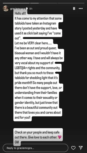 While that message is no longer visible on McGraw's Insta, a followup Instagram Stories post on June 3 doubled down, taking note of "click bait" reports from "some tabloids" and confirming that her Pride post was the real deal.